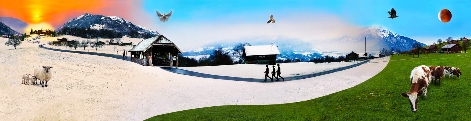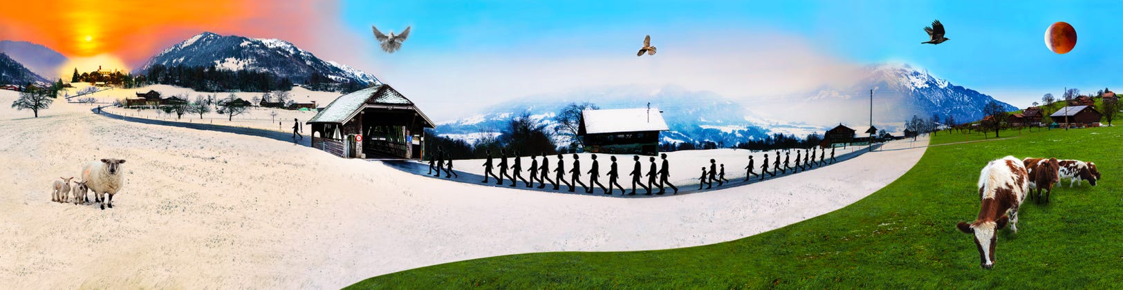 Auf dem feinen Lichtpfad gehen zwei Kinder, der Pfad führt zu Bruder Klaus und seiner Frau Dorothee die sich in der Mitte des Bildes treffen... die Menschen unten im Bild gehen ihren Weg und bemerken noch nicht, wie still und leise das honiggelbe Licht den Kirchturm beleuchtet. Auf dem Zifferblatt der Turmuhr sind drei Zeiger nach innen und drei Zeiger nach aussen gerichtet... von innen nach aussen, von aussen nach innen.