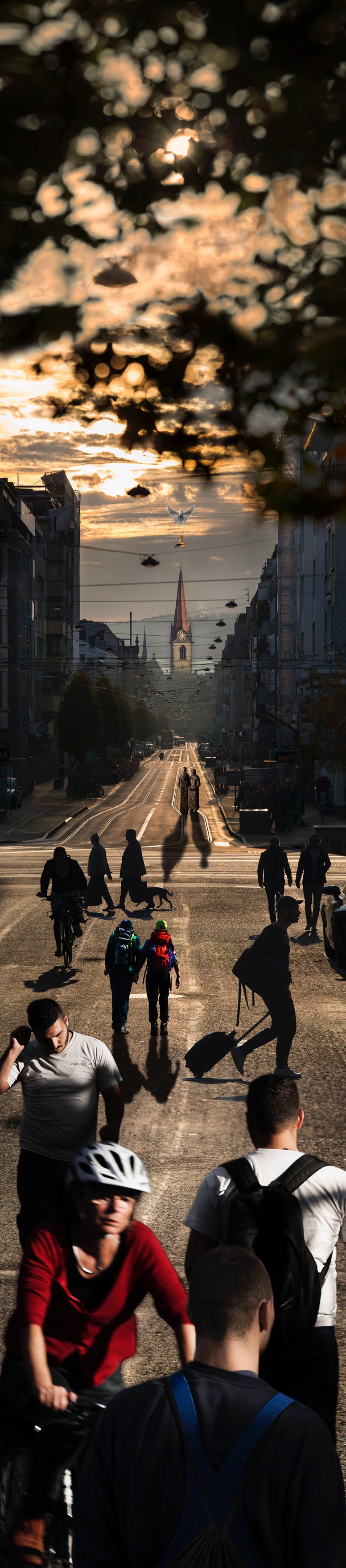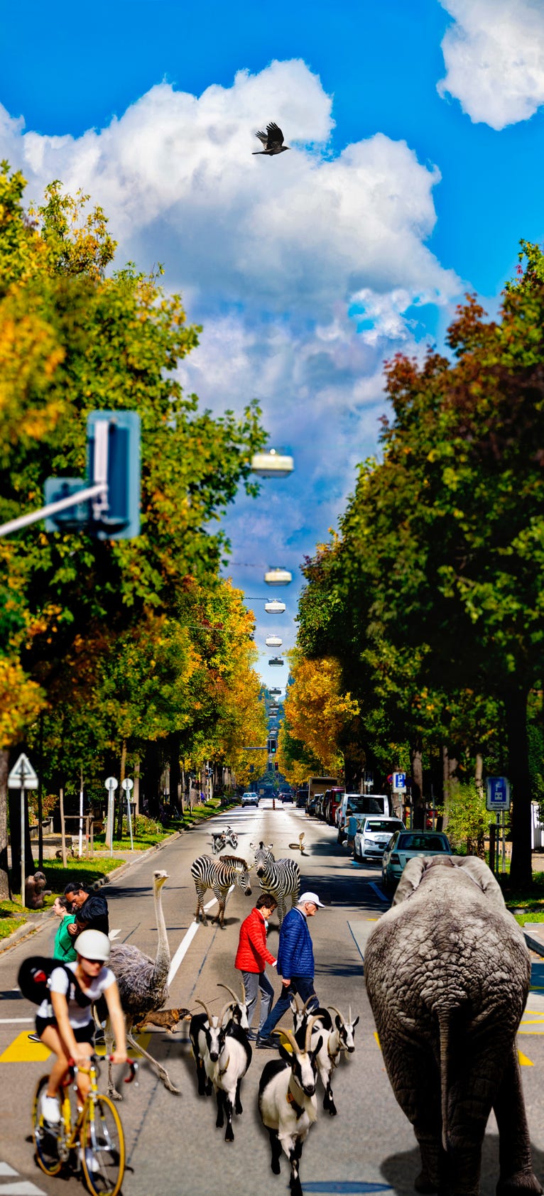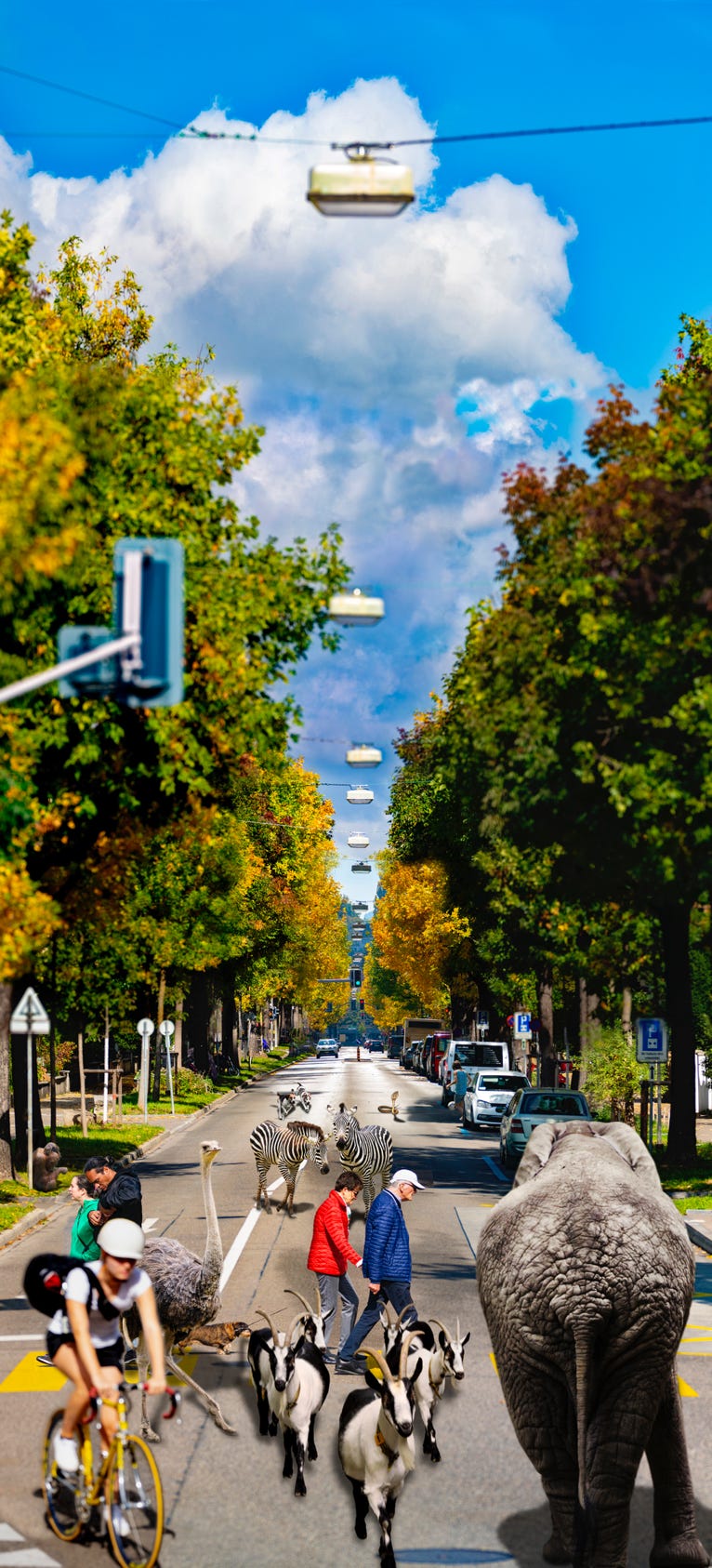 Auf der belebten Allee treffen sich Mensch und Tier... begegnen sich in Würde... auf gleicher Höhe, auf derselben Strasse und jedes Wesen geht mit Respekt vor dem anderen... seinen eigenen Weg.