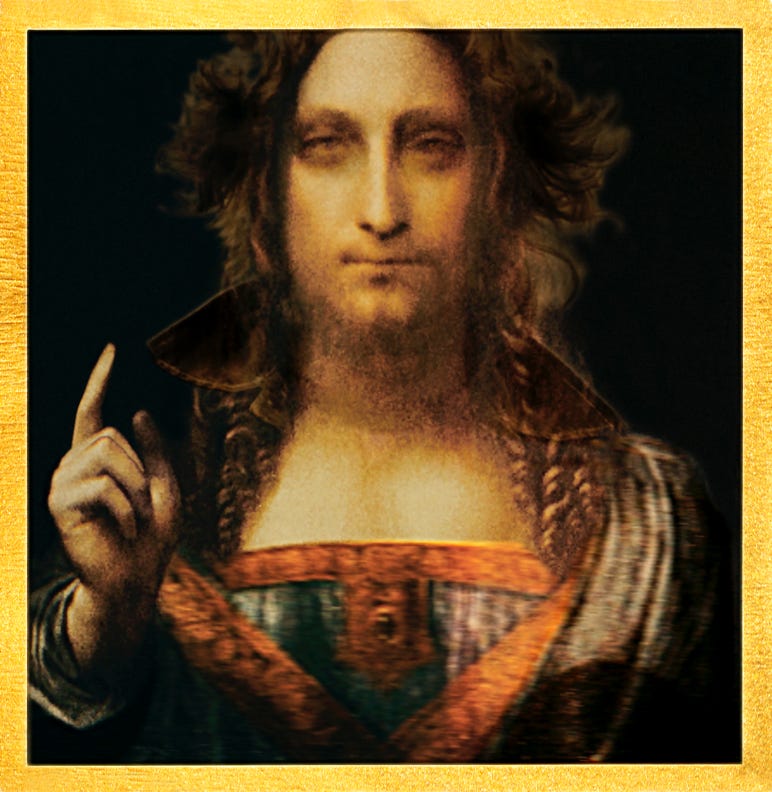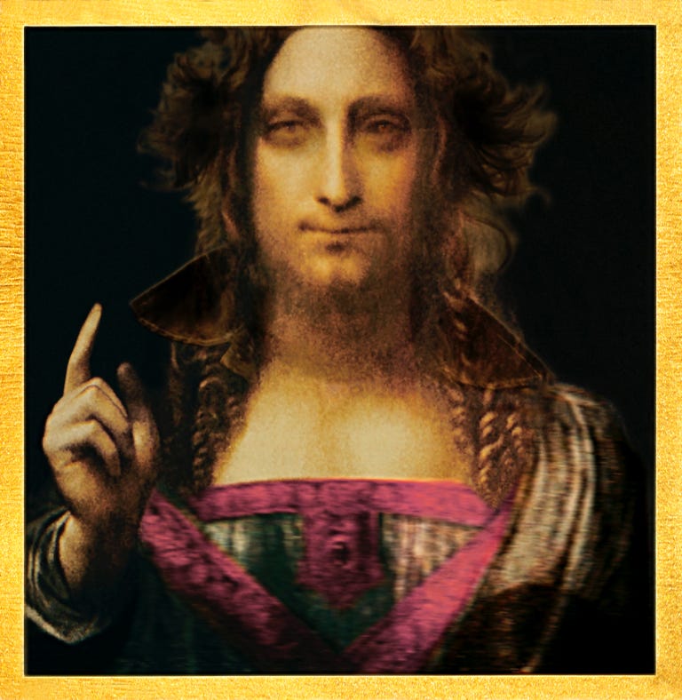 Erlöser'in. Provozierend aber erklärend. Diese veränderte Darstellung des Da-Vinci-Gemäldes “Salvator Mundi”. Jesus mit weiblichen Zügen. Nicht die Hand mit zwei ausgestreckten Fingern zum Segen erhoben, sondern ein Finger der nach oben zeigt.